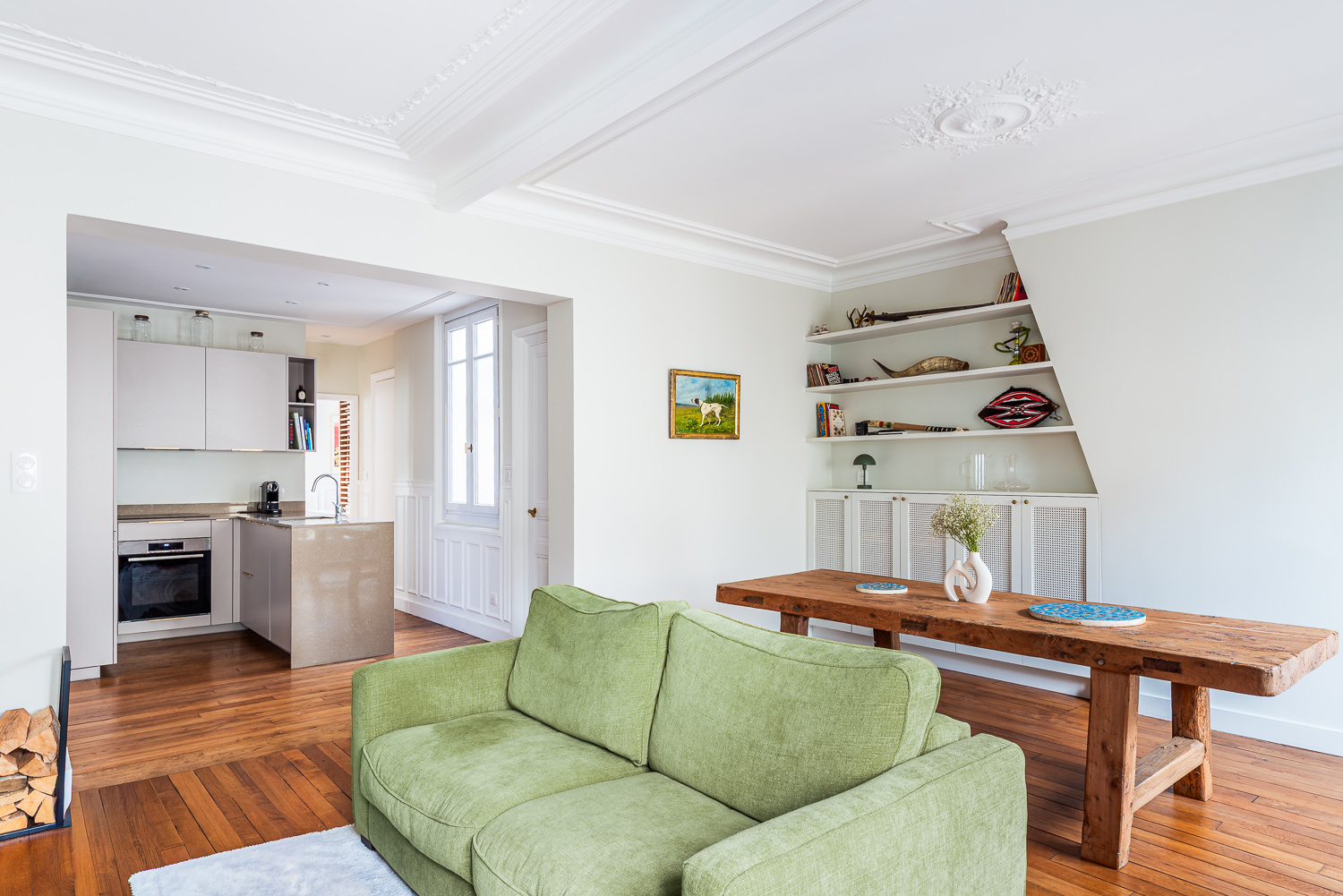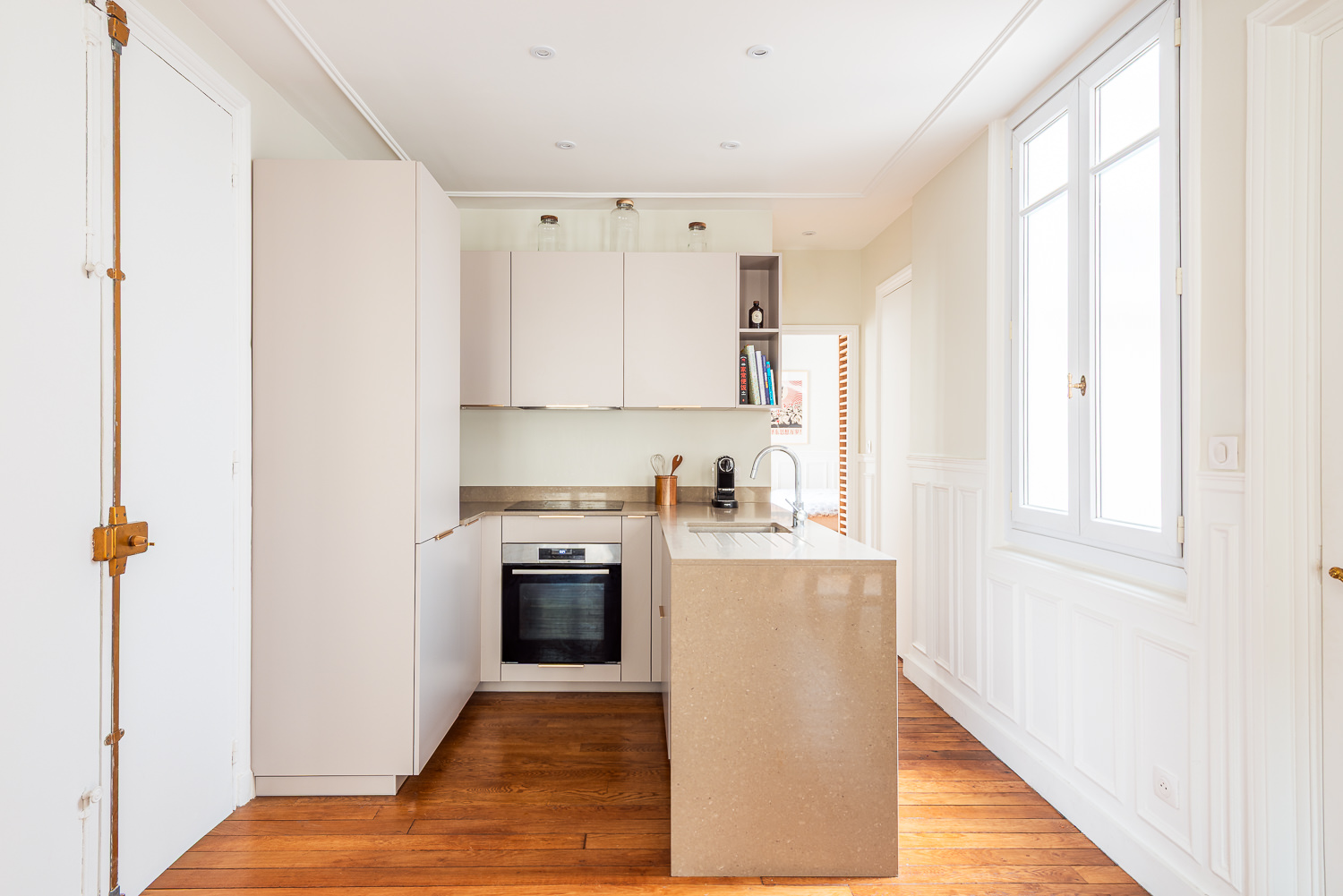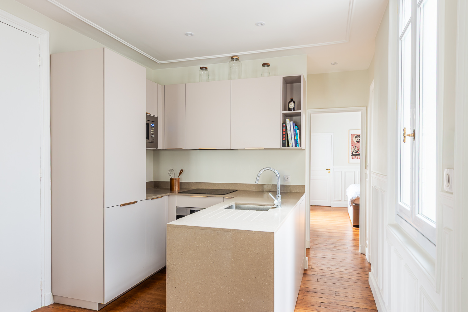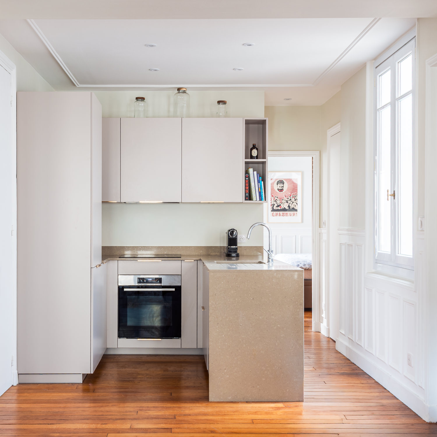 Initialement située à l’écart, la cuisine a été déplacée au centre de l’appartement, devenant ainsi le véritable pivot du lieu.