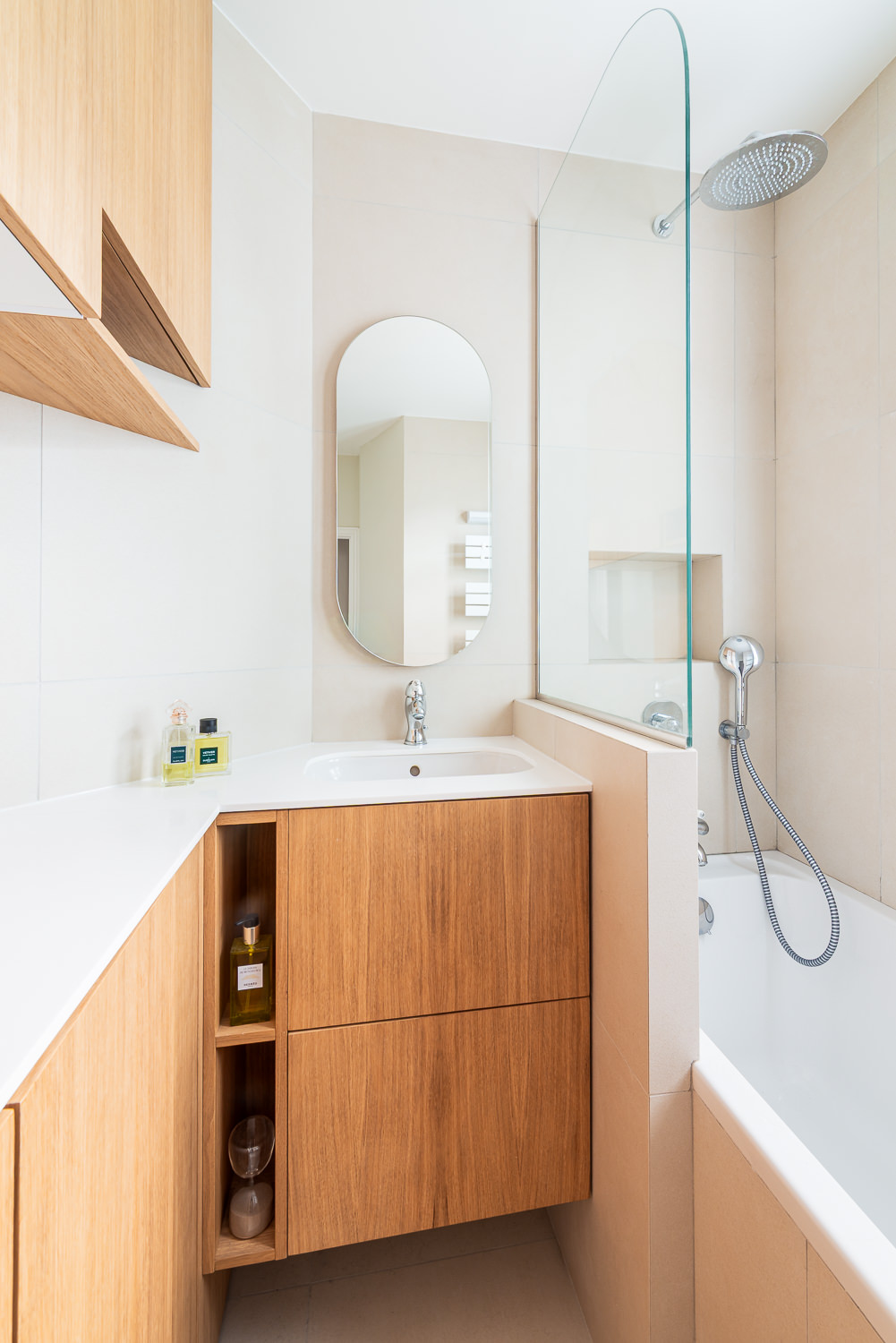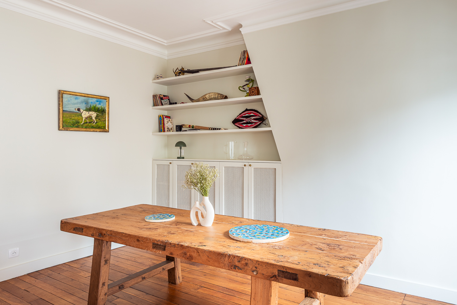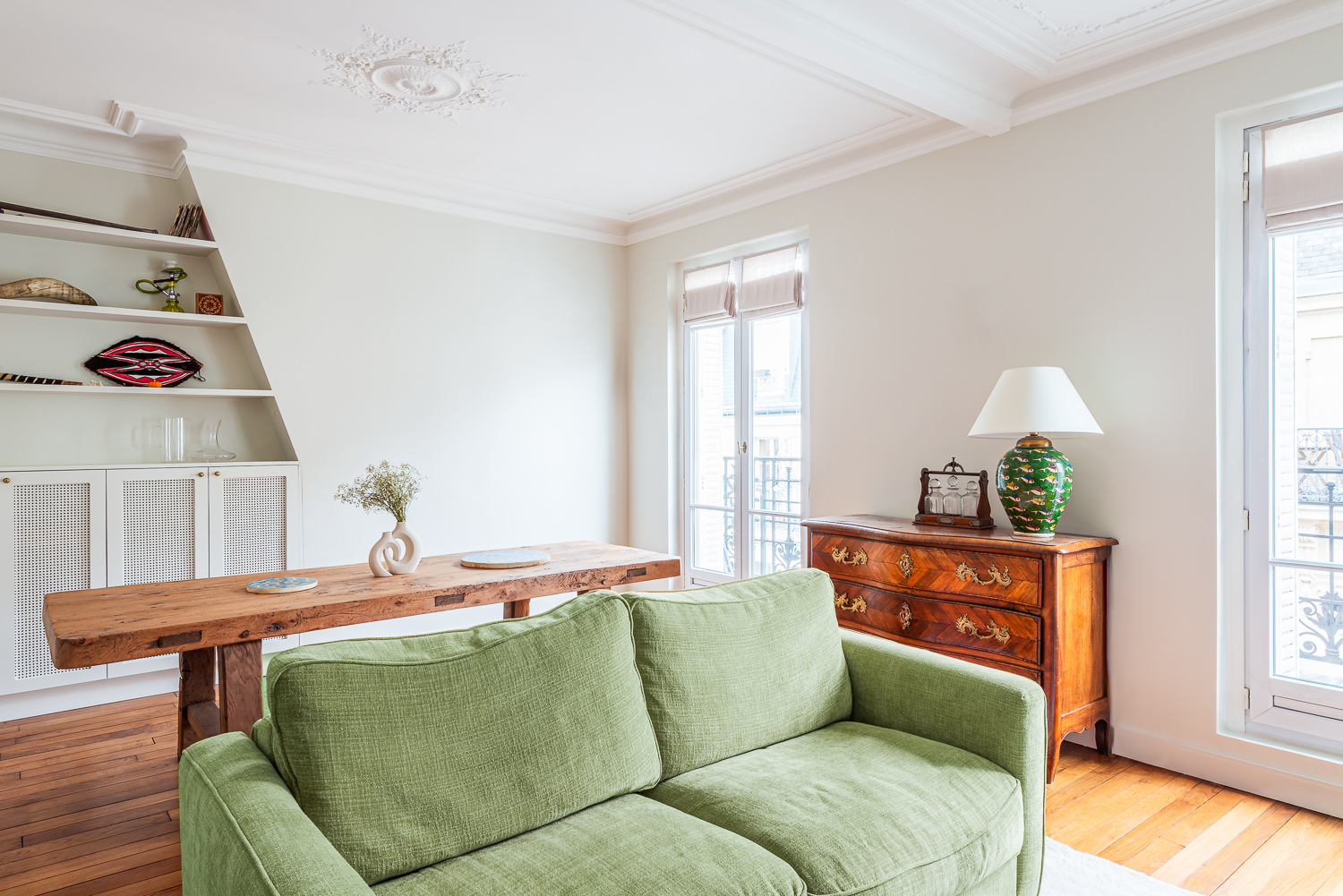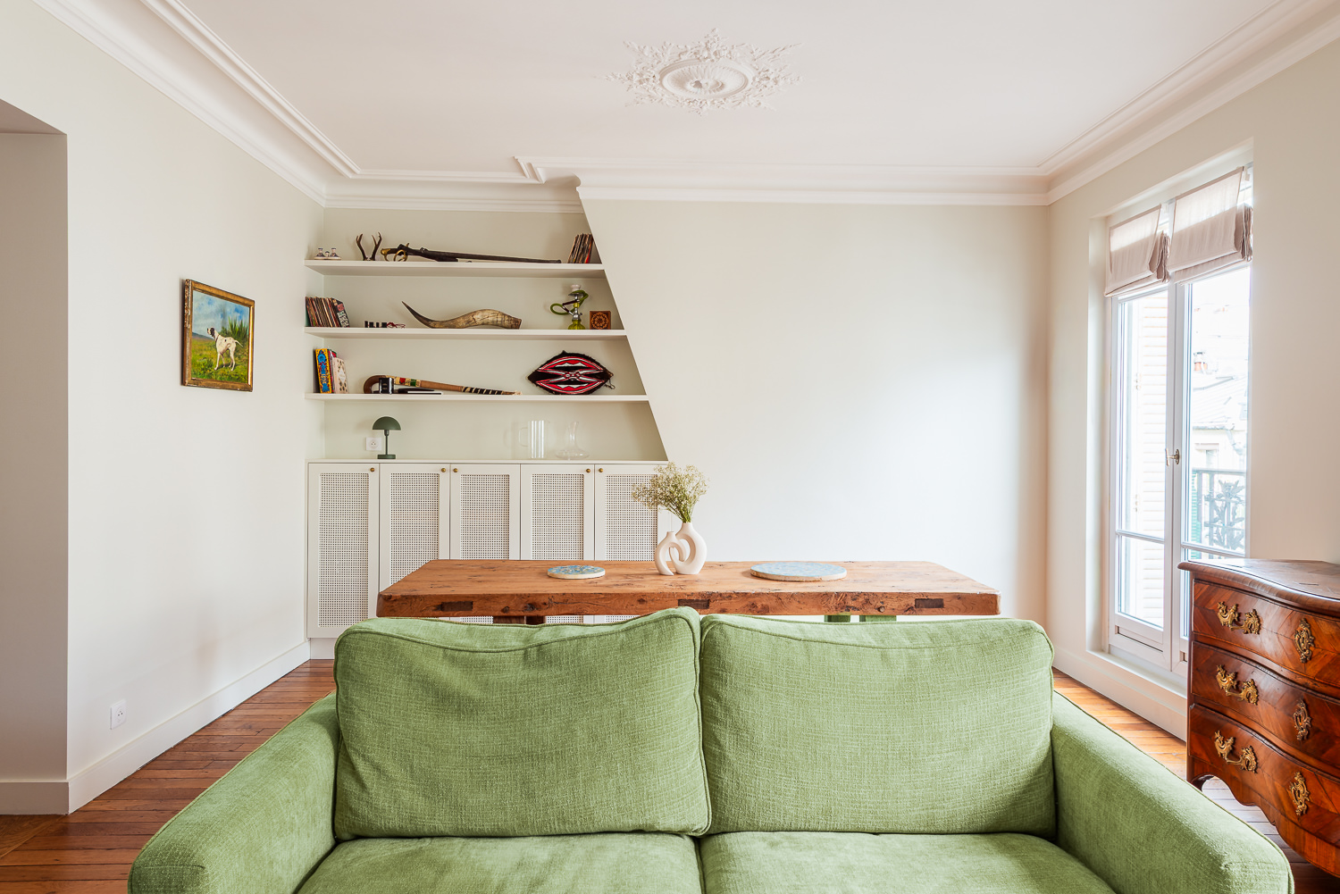 Initialement située à l’écart, la cuisine a été déplacée au centre de l’appartement, devenant ainsi le véritable pivot du lieu.