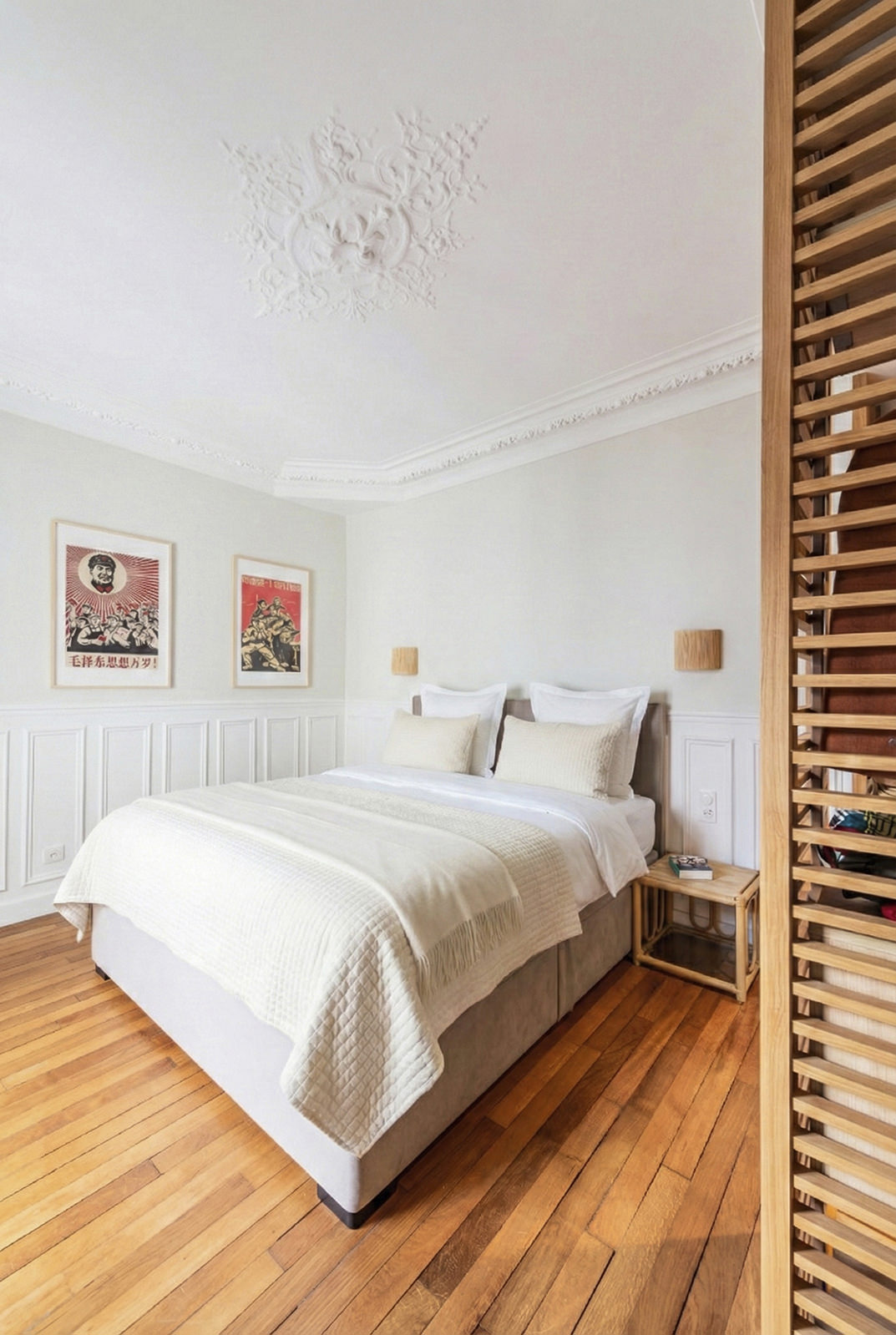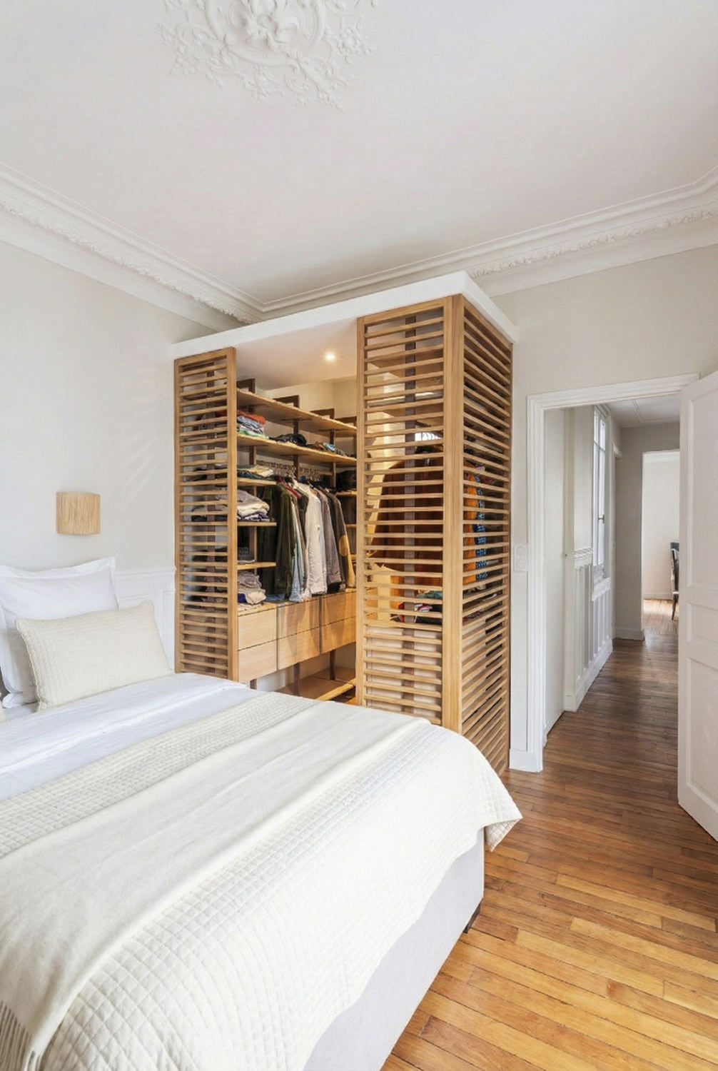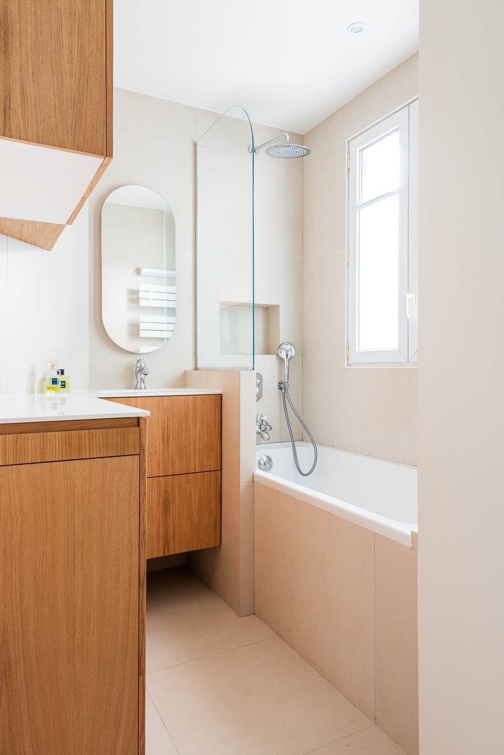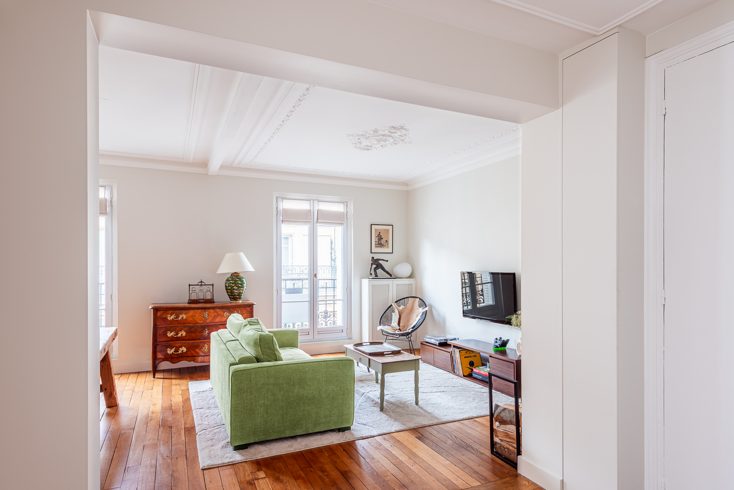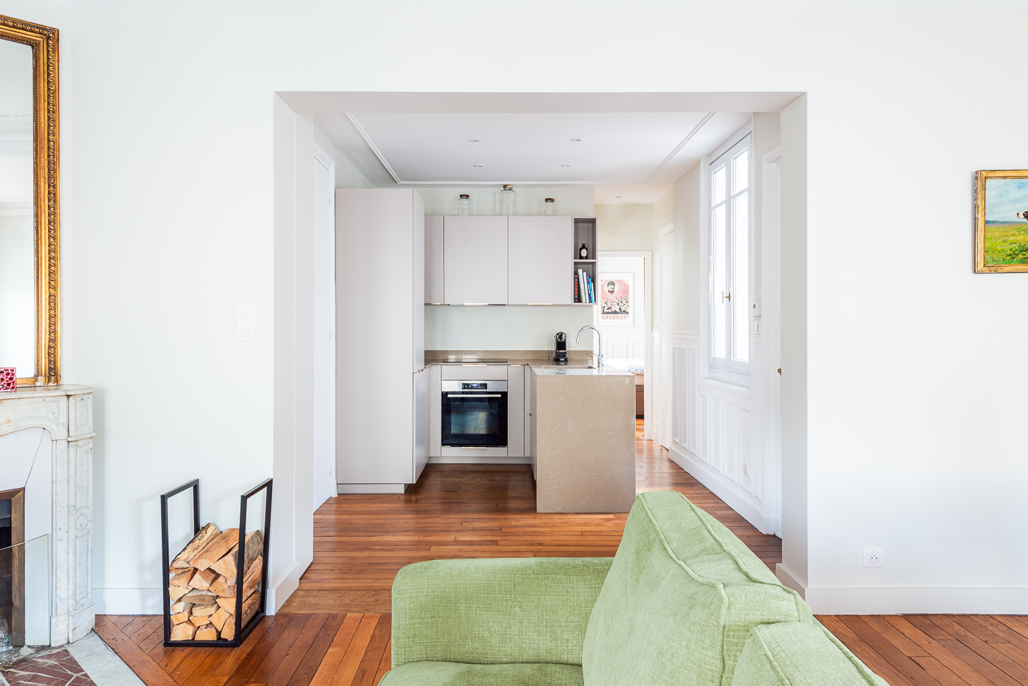 Rénovation d’un appartement haussmannien de 60 m² à Paris, repensé pour replacer la cuisine au cœur des espaces de vie.